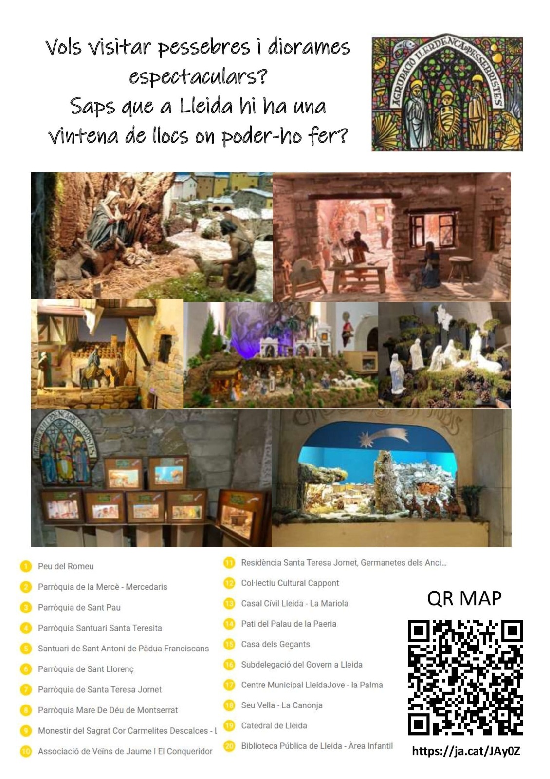 Si en aquestes festes de Nadal, encara no heu anat a visitar pessebres, sou a temps de fer-ho. Per facilitar aquesta singular “Ruta Pessebrista, l’Agrupació Ilerdenca de Pessebristes en una molt interesant iniciativa, ha creat un mapa virtual per tal de facilitar la visita als indrets on hi ha exposats pessebres i diorames. Aquest mapa virtual, que incorpora fins i tot un codi QR, ha estat dissenyat pel nostre company Xavier Pérez “Litus”, membre de la junta directiva. Per accedir-hi podeu fer-ho mitjançant l’enllaç: https://ja.cat/JAyOZ
