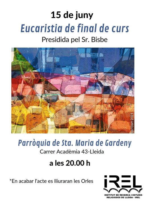 L'Institut de Recerca i Estudis Religiosos de Lleida (IREL) celebrarà l'Eucaristia de final de curs el dimarts 15 de juny a les 20.00 hores a la parròquia de Santa Maria de Gardeny. Enguany es farà en aquest temple per encabir el màxim d'alumnat i famílies en aquest acte.