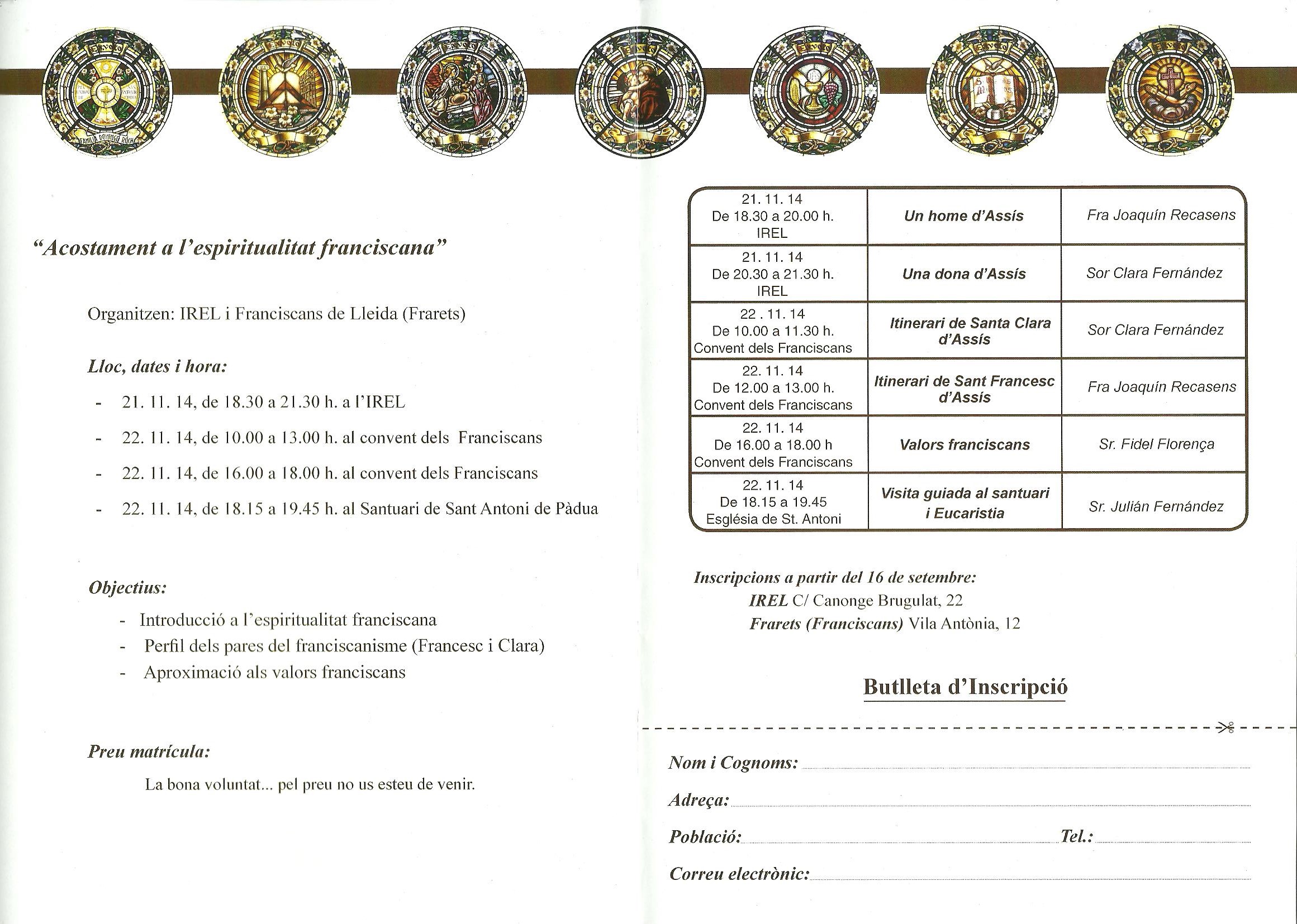 Aquest seminari se celebra per commemorar el setè centenari del pas de Sant Francesc per Lleida i qui vulgui apuntar-s’hi pot fer-ho a l’Institut Superior de Ciències Religioses (carrer Canonge Brugulat, 22) o al mateix Convent dels Frarets (Vila Antònia, 14).