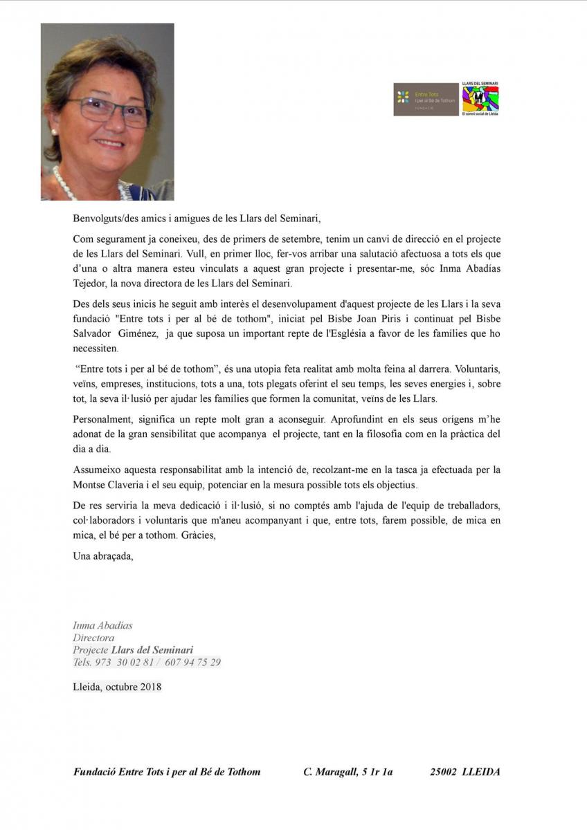 Com ja us informavem la setmana passada que Imma Abadías ha estat escollida nova directora voluntària de les Llars del Seminari en substitució de Montse Claveria, que ha deixat el càrrec després de tres anys al front de l'entitat. A continuació us deixem amb les cartes d'ambdues, en les quals expliquen la seva experiència.