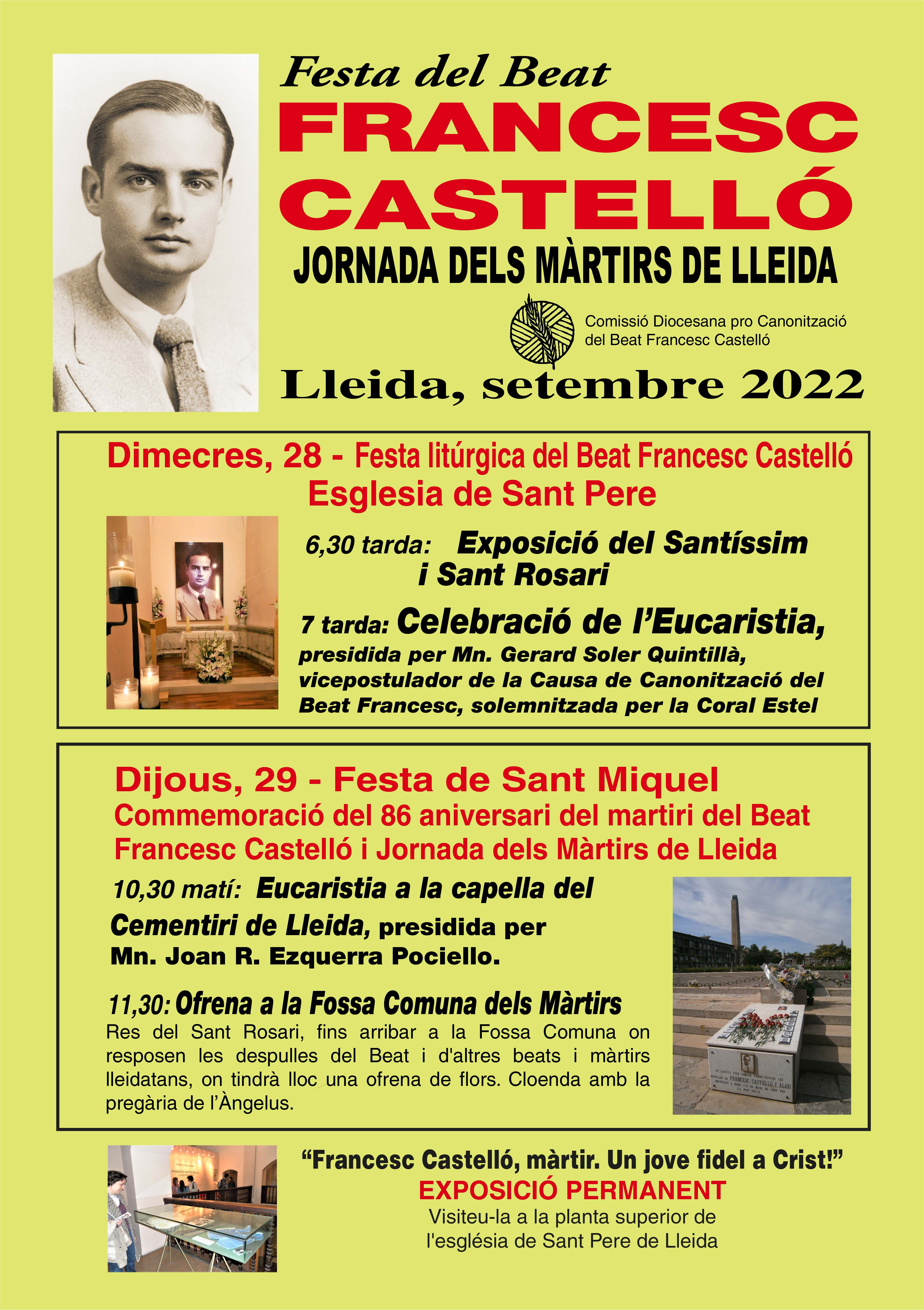 Los actos religiosos programados en honor del Beato, se iniciarán el miércoles 28 de septiembre, día de su fiesta litúrgica, en la iglesia de Sant Pere de Lleida, que fue en vida su parroquia, donde habrá una capilla dedicada al joven mártir. Así mismo, en la planta superior del templo, se encuentra una exposición permanente bajo el título “Francesc Castelló, màrtir. Un jove fidel a Crist”, dedicada a dar a conocer su vida y martirio y que permanecerá abierta durante toda la jornada.