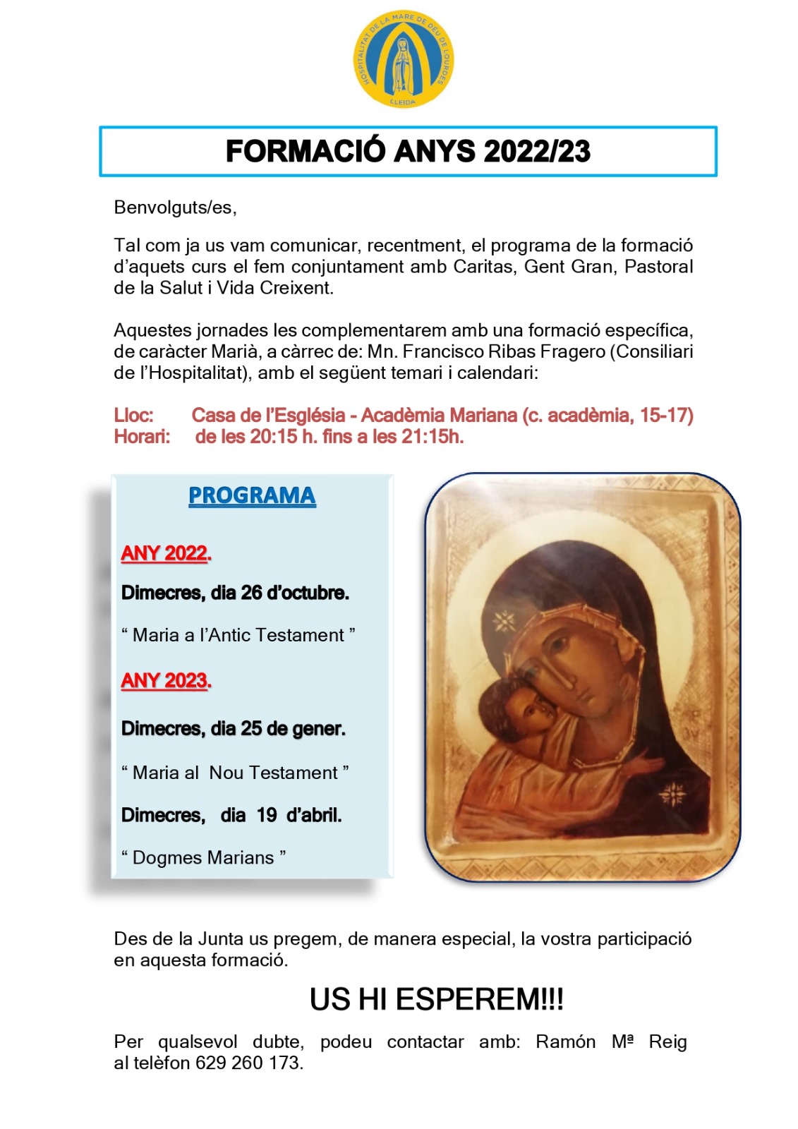 L'Hospitalitat de la Mare de Déu de Lourdes engega, juntament amb Càritas, Gent Gran, Pastoral de la Salut i Vida Creixent el programa de formació d'aquest curs 2022-23 que començaran el proper 26 d'octubre. Les jornades es complementen amb una formació específica de caràcter Marià, a càrrec de mossèn Francisco Ribas Fragero, consiliari de l'Hospitalitat.