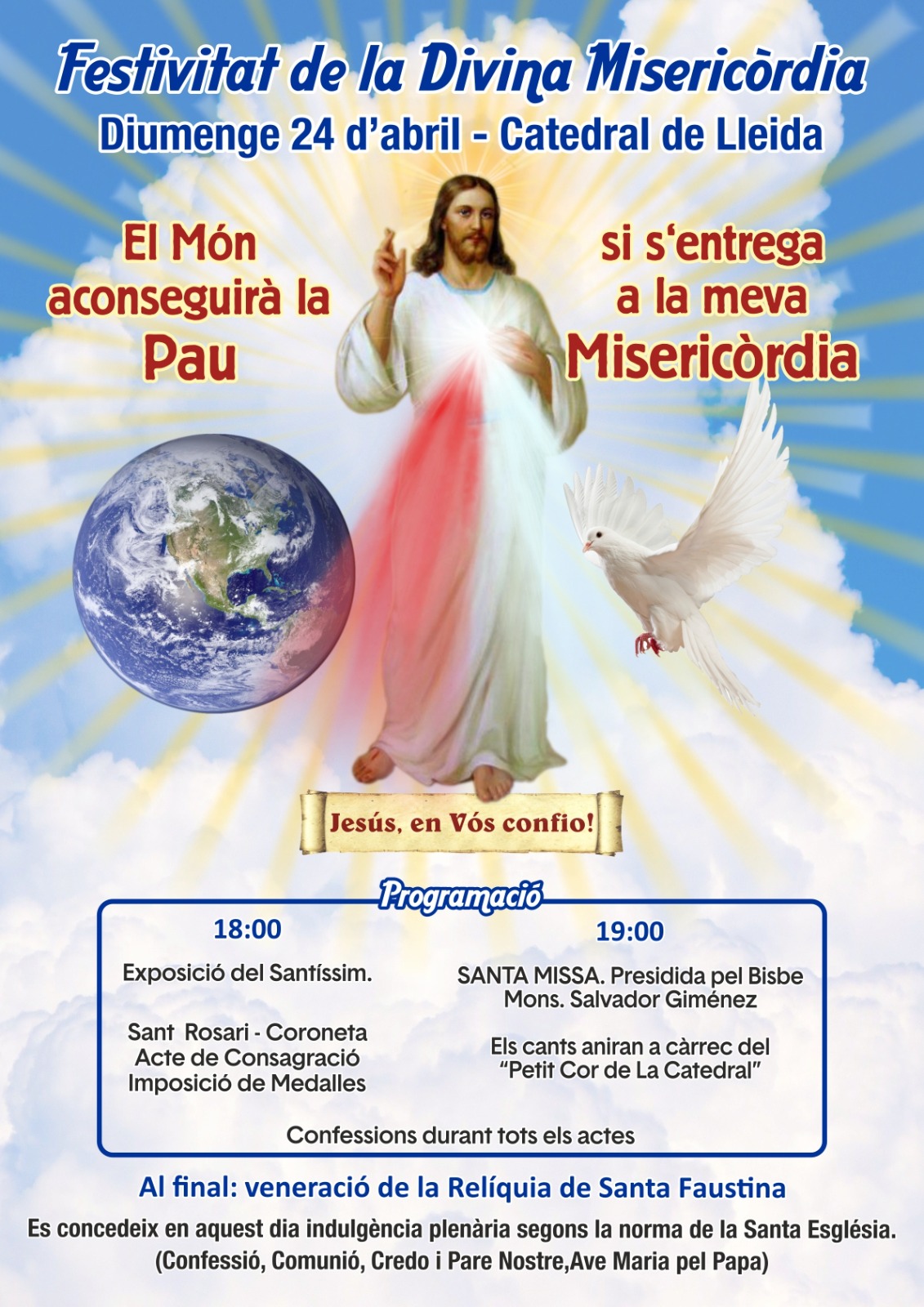 També en aquesta hora hi haurà el rés del Sant Rosari, La Coroneta, l'acte de consagració i imposició de medalles. A les 19.00 hores el Bisbe Salvador presidirà la Santa Missa. Els cants aniran a càrrec del 'Petit Cor de la Catedral'. Al final de la cerimònia tindrà lloc la veneració de la relíquia de Santa Faustina. Cal recordar que es concedeix indulgència plenària segons la norma de la Santa Església (confessió, comunió, credo i Pare Nostre, Ave Maria pel Papa).