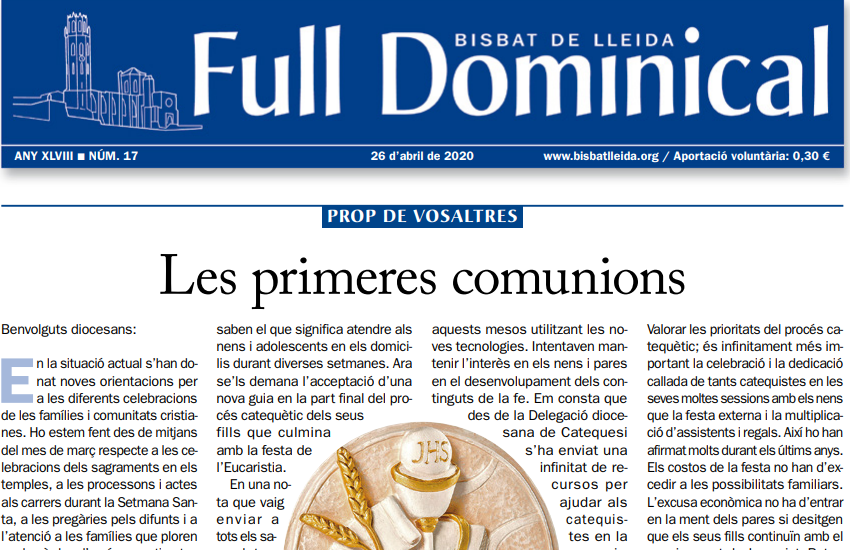 El Bisbat de Lleida crea un fons diocesà per atendre persones vulnerables arran de la crisi social per la Covid-19