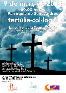 La parròquia de Sant Andreu de Lleida acollirà el pròxim 9 de març una tertúlia-col•loqui amb títol 'La realitat de la Setmana Santa a Lleida i en terres de missió'. L'objectiu de la trobada és atansar la vivència de la Setmana Santa en països allunyats per comparar-la amb la realitat a Ponent.