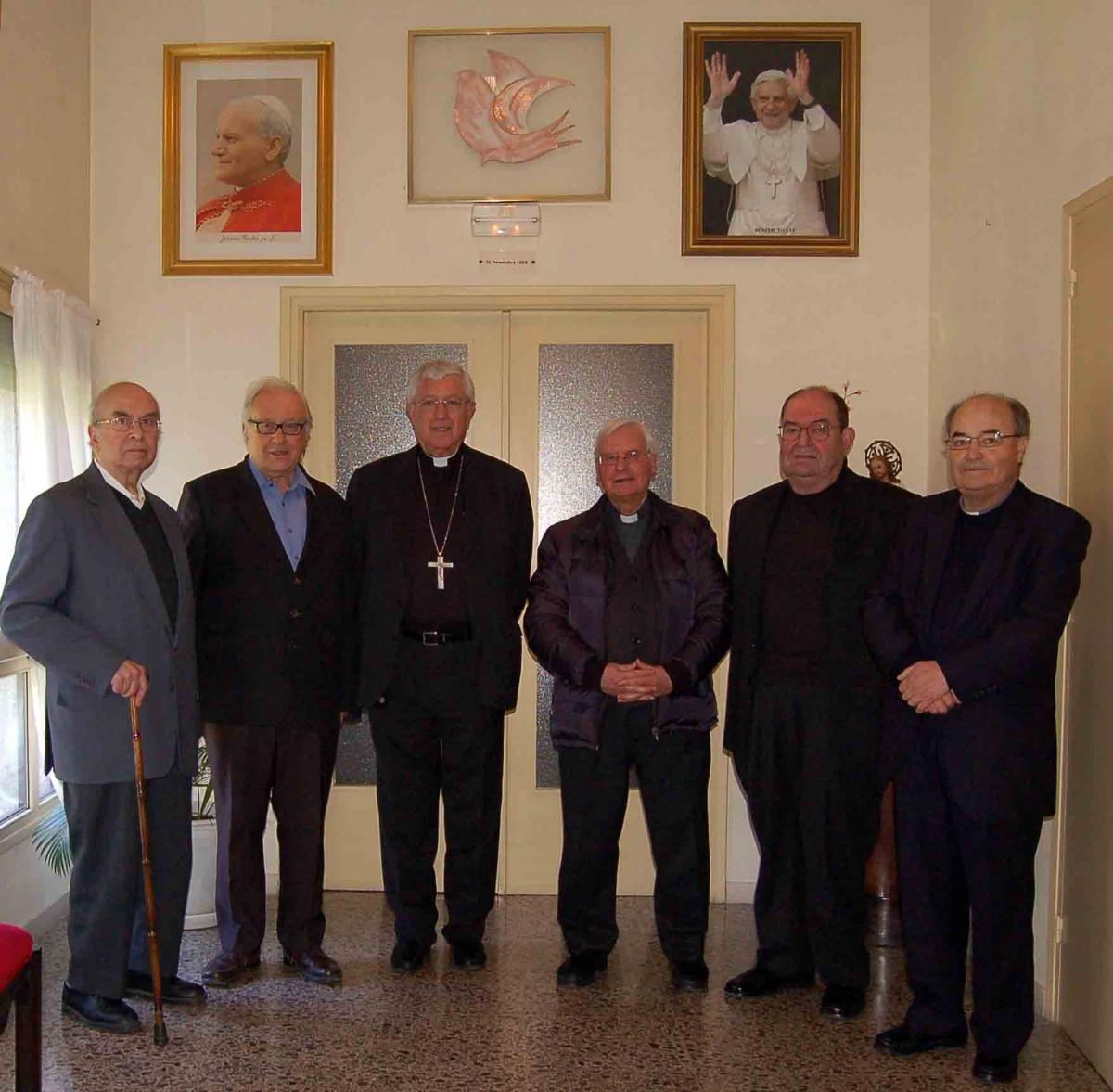 El dinar de germanor a la Casa Sacerdotal ha estat el moment per retre homenatge als sis preveres que enguany compleixen les noces d’or ministerials. Aquests són Mn. Jacint Cotonat, director dels arxius de la Catedral i del Bisbat; l’esmentat Mn. Gerard Soler; Mn. Antonio Abadías Catalán, rector de la catedral de Barbastre, i els pares Fernando Rodríguez Gavilán, franciscà, i els jesuïtes Joan Llargues Solà i Pere Terradas Candell. Enguany no hi ha cap mossèn que faci les noces de plata a la nostra Diòcesi