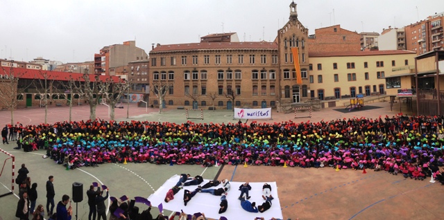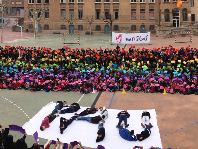 Contra això, des del col·legi Maristes volem i podem posar-hi color, denunciar les injustícies i apostar pel diàleg. Finalment, tots plegat van cantar la peça "El món seria més feliç" tot traçant un mural humà gegantí formant l'arc de Sant Martí, amb la voluntat d'esdevenir portadors de pau en el nostre entorn, aportar aquest color a les nostres vides i contagiar-lo arreu durant tot l'any.