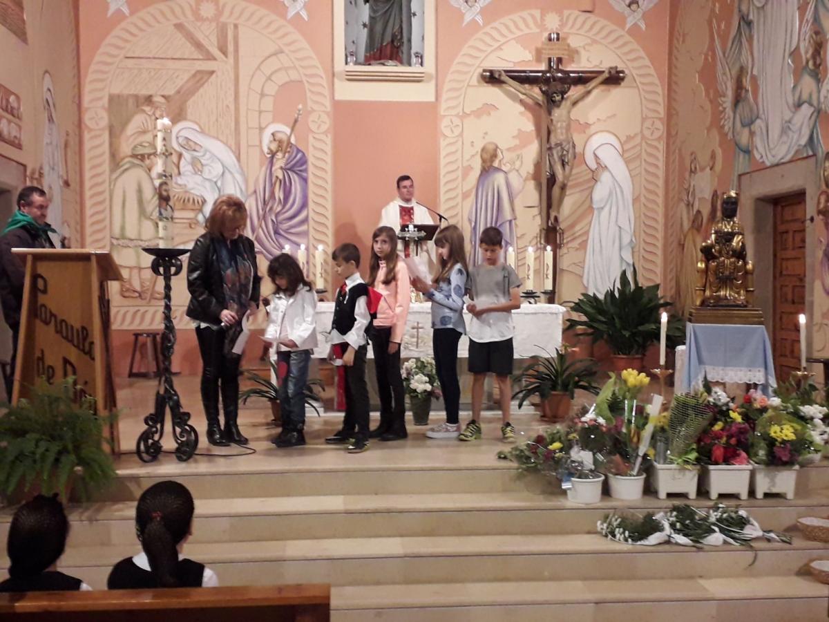 La celebració s’inicià amb la tradicional ofrena floral a la imatge de “La Moreneta” que havia estat col•locada en un lateral del presbiteri, a càrrec dels nens i nenes del poble vestits de catalanets. Tot seguit tingué lloc la celebració de l’Eucaristia en honor de la Mare de Déu de Montserrat, oficiada per Mn. Josep Solé de les Borges Blanques, ja que el rector del poble Mn. Santiago Mataix oficiava en aquella mateixa hora la Missa de la Festa Major en honor al Sant Crist, al veí poble del Cogul del qual també n’és rector.