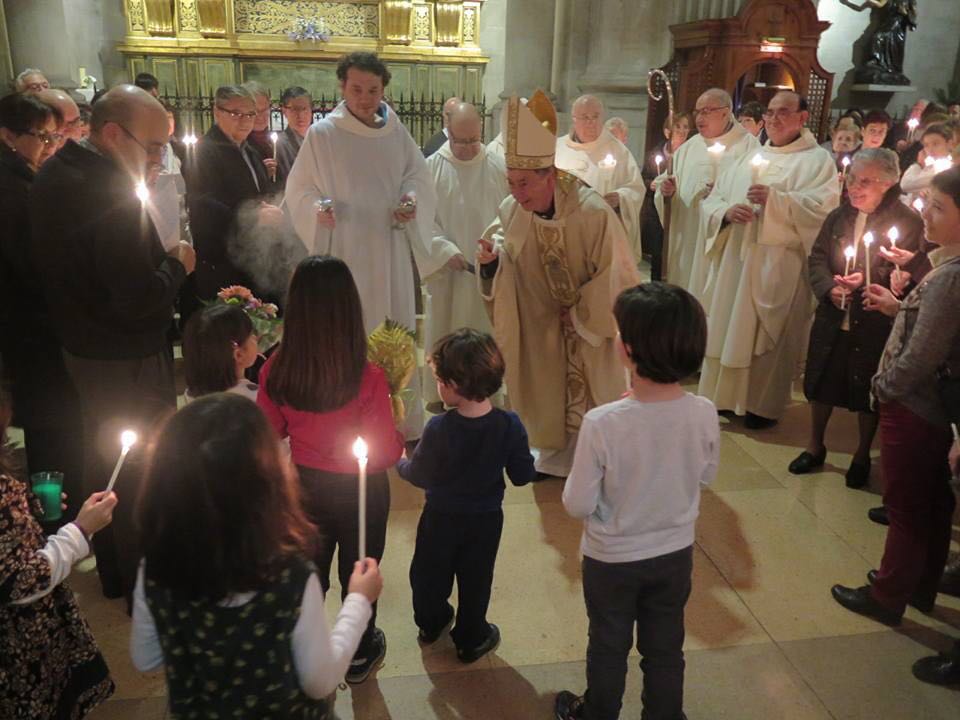 La celebració s'inicià puntualment a les 6 de la tarda amb la benedicció de les candeles, pròpia de la festivitat que feu el bisbe de Lleida Salvador Giménez Valls, que tot seguit presidí l'Eucaristia. En la seva homilia el bisbe s'adreçà als infants i famílies de manera pedagògica referint-se a les dues dimensions de Jesús, la humana i la divina que en la festa de la Presentació de Jesús al Temple són prou evidents: "Jesús és presentat com a home al Temple, però ell és alhora la llum que il·lumina les nostres vides.