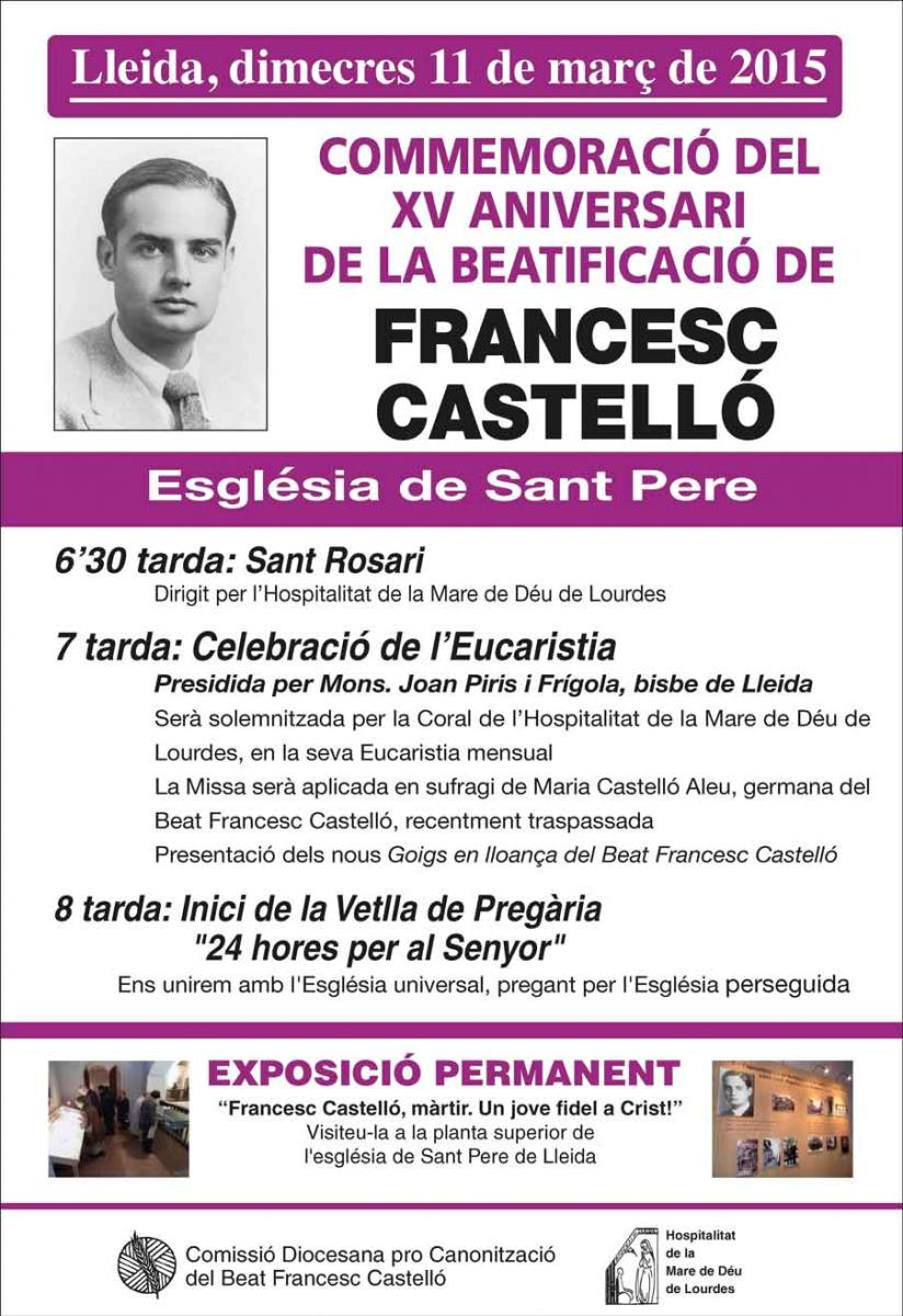 L’església de Sant Pere de Lleida, la que fou en vida la seva parròquia, acollirà el proper 11 de març la commemoració del XIV aniversari de la beatificació del jove màrtir lleidatà Francesc Castelló Aleu, beatificat pel papa Sant Joan Pau II l’11 de març de l’any 2001.