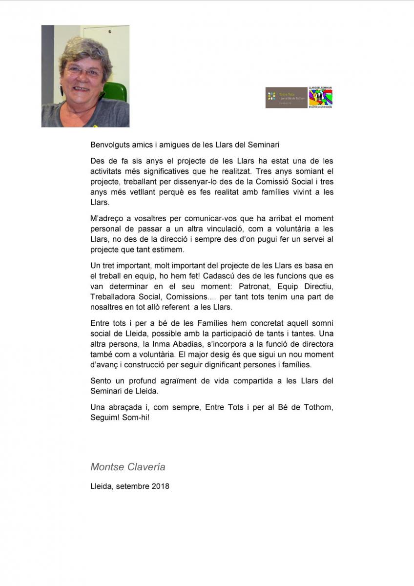 Com ja us informavem la setmana passada que Imma Abadías ha estat escollida nova directora voluntària de les Llars del Seminari en substitució de Montse Claveria, que ha deixat el càrrec després de tres anys al front de l'entitat. A continuació us deixem amb les cartes d'ambdues, en les quals expliquen la seva experiència.