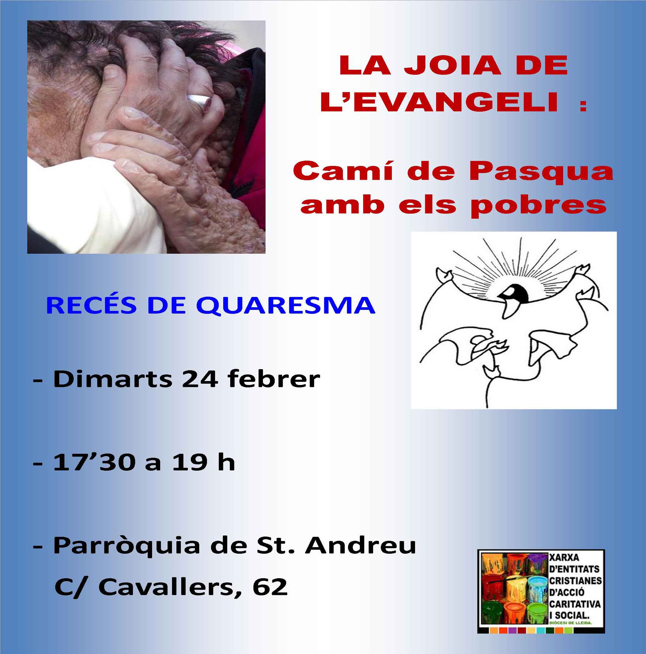 La Xarxa d’Entitats cristianes d’Acció Caritativa i Social del Bisbat de Lleida celebrarà el seu Recés de Quaresma el pròxim 24 de febrer, de dos quarts de sis de la tarda fins a les 7 del vespre, a la parròquia de Sant Andreu.