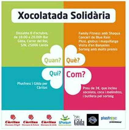 Plusfresc i el bar Gilda organitzaran el pròxim dissabte 8 d'octubre una xocolatada solidària en benefici de Càritas. La trobada solidària tindrà lloc al bar Gilda, carrer del Rei s/n de Lleida, entre les 18.00 i les 20.00 hores del dissabte.