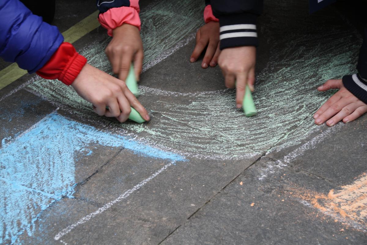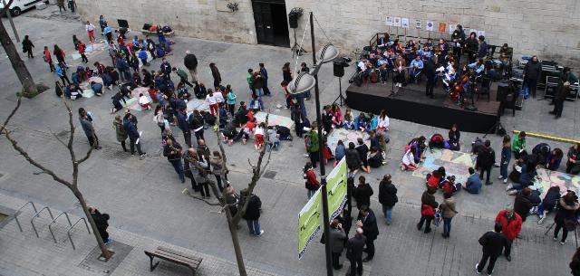de sisè de primària i de primer d'ESO van fer dibuixos a terra sobre els valors que han treballat durant setmanes amb l'ajuda de la Paràbola del Bon Samarità com a referent d'una cultura i d'una ètica de l'acollida. Els escolars han treballat l'acollida en un context d’exclusió com el que estan vivint infants i famílies refugiades que fugen de la guerra i de la misèria a les portes d’Europa, sense poder-hi entrar.