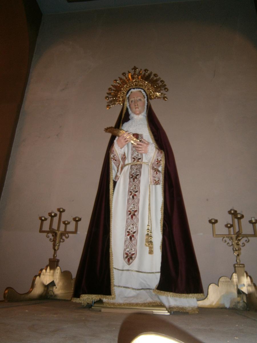Tot i aquesta autoria, també treballà en l’execució de la nova talla l’escultor Ramon Aumedes, deixeble de Mayné. La imatge de la Verge es presenta vestida amb un túnica blanca (símbol de puresa) i mantell vermell (símbol del martiri), portant en les seves mans una palma amb un rosa incrustada fent així referència a la sang vessada pel seu fill Jesús en el martiri de la Creu.