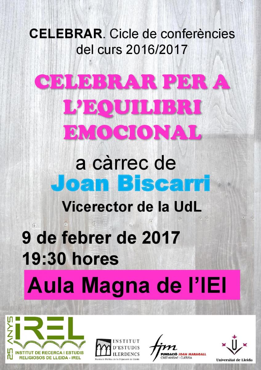 El vicerector de la UdL, Joan Biscarri, impartirà el dijous 9 de febrer la conferència 'Celebrar per a l'equilibri emocional' dintre del cicle de conferències 'Celebrar' amb motiu del 25 aniversari de l'IREL (Institut de Recerca i Estudis Religiosos de Lleida).