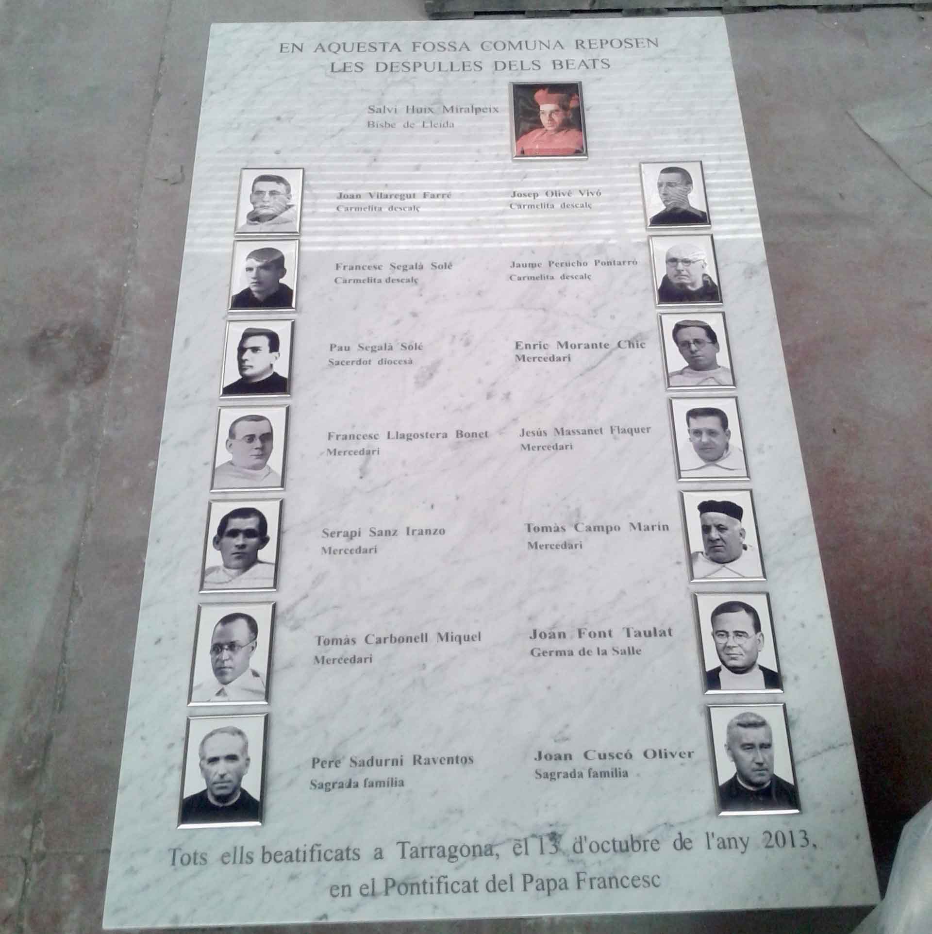 Una làpida, amb els noms i les fotografies del bisbe Salvi Huix Miralpeix i els 14 màrtirs beatificats a Tarragona el passat mes d’octubre, serà col·locada i beneïda el pròxim diumenge 4 de maig en un acte que es realitzarà a la fossa comuna del Cementiri de Lleida, on hi ha enterrades les seves despulles.