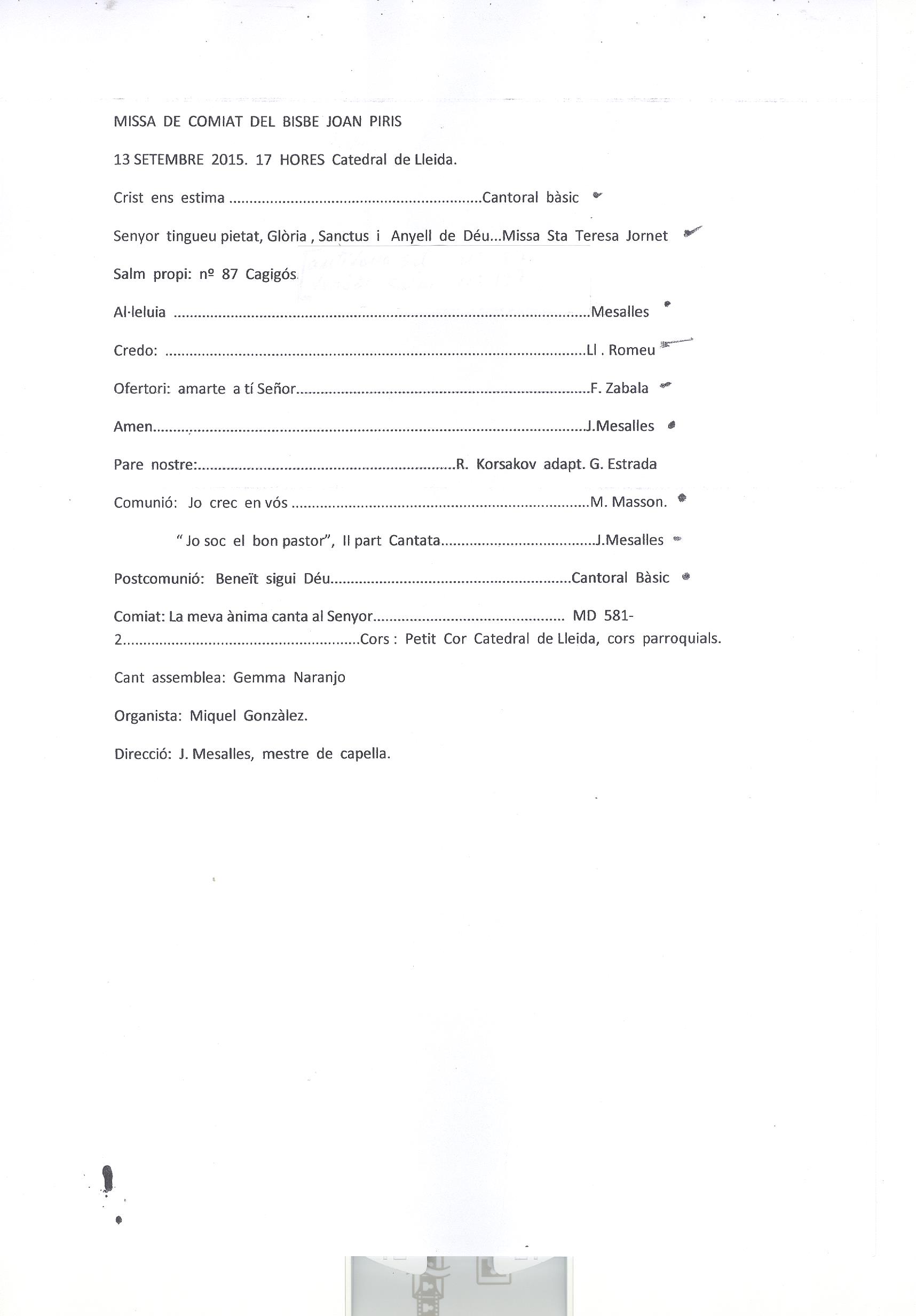 Els dies d'assaig seran el 9 de setembre, per la Missa del bisbe Piris, i el 16 i 18, per la del bisbe Salvador, de les 20,30 hores a les 23. L'accés a la Catedral serà pel carrer Sant Antoni. Si trobeu la reixa tancada, podeu trucar al telèfon 609883991 (Anna Maria), perquè us obrin.
