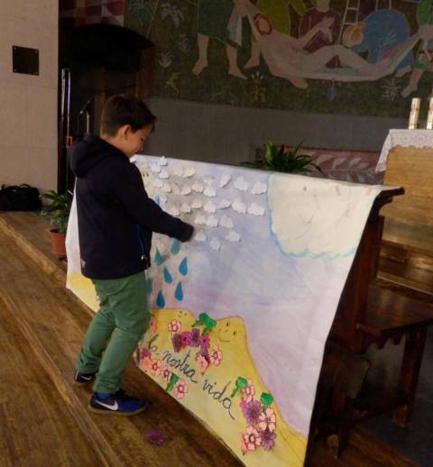 A continuació, Mn. Víctor va fer una reflexió amb els nens mentre els pares ho feien amb Mn. Robert Louan. Es tractava d’aprofundir en el missatge del conte per traslladar-lo a l’àmbit personal, descobrir en quins moments o situacions no som núvol i ho hauríem de ser, i motivar un petit canvi com a camí de conversió de cara a la Pasqua: ‘No podem canviar el món, però sí podem canviar el nostre entorn’, va dir. Una entretinguda dinàmica de joc va propiciar la coneixença i relació dels nens entre ells.