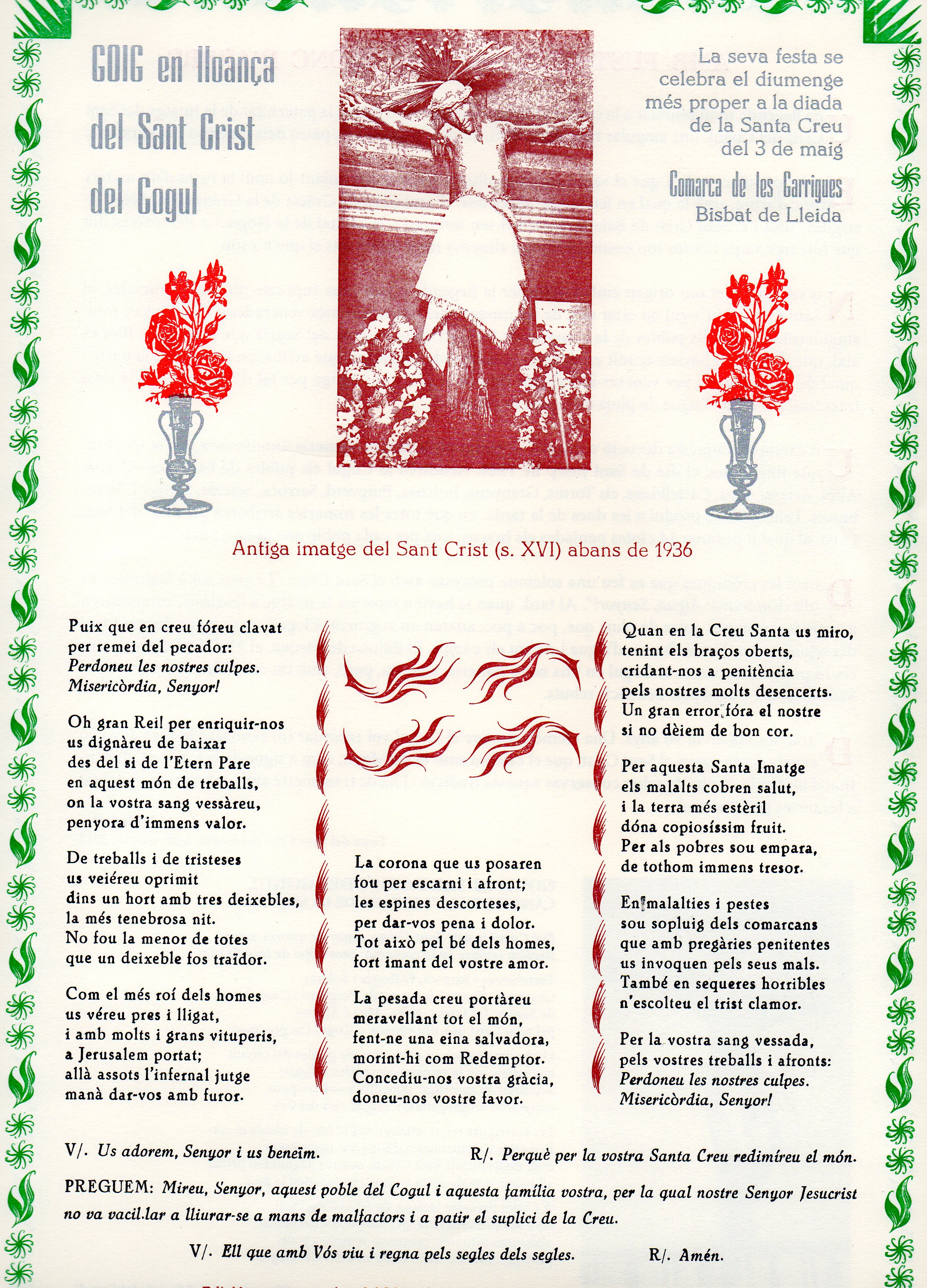 Us adjuntem una crònica històrica de la tradició de la imatge del Sant Crist, de la qual és autor Jordi Curcó, i el nous goigs de lloança.