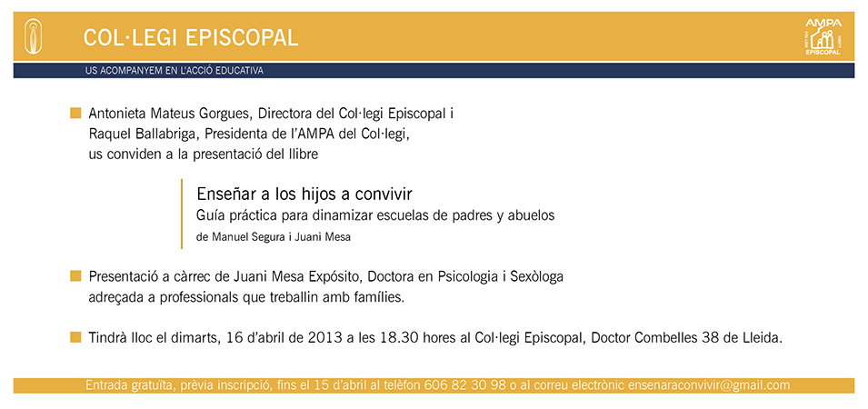 El Col.legi Episcopal ens convida (prèvia inscripció gratuïta a ensenaraconvivir@gmail.com) a la presentació del llibre "Enseñar a los hijos a convivir" de Manuel Segura S.J. i Juani Mesa.