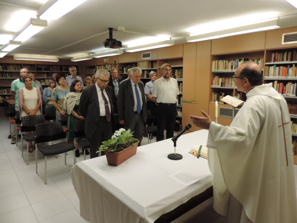 La biblioteca de la FCC es va convertir durant una hora en una capella per celebrar l'Eucaristia presidida pel consiliari de la FCC, Joan Costa.