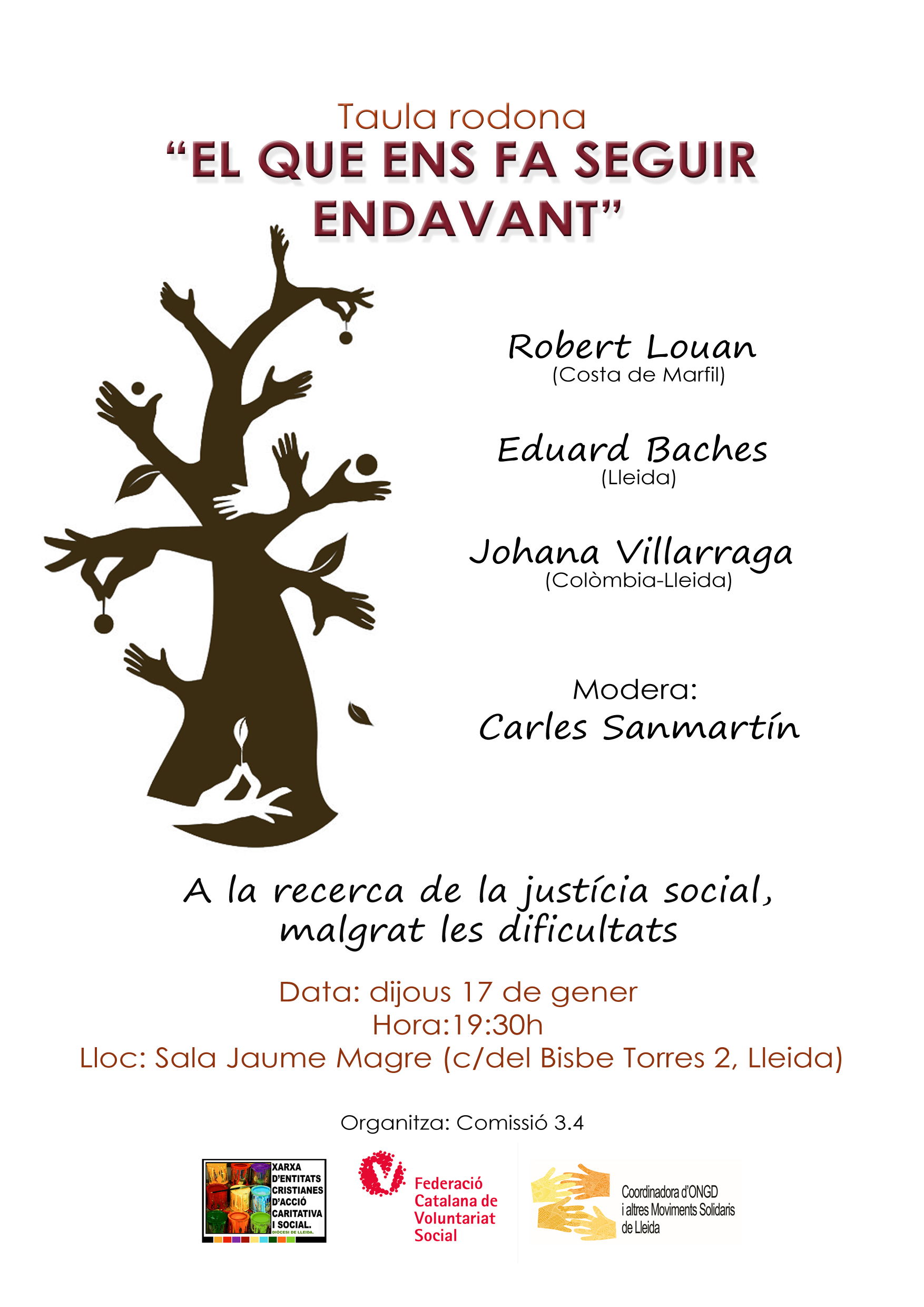 En aquesta taula organitzada per la Comissió 3.4 (Xarxa d’entitats Cristianes d’acció Caritativa i Social del Bisbat de Lleida, Federació Catalana de Voluntariat Social i Coordinadora d’ONGD i altres Moviments Solidaris de Lleida) es vol posar de manifest el que ens empeny a