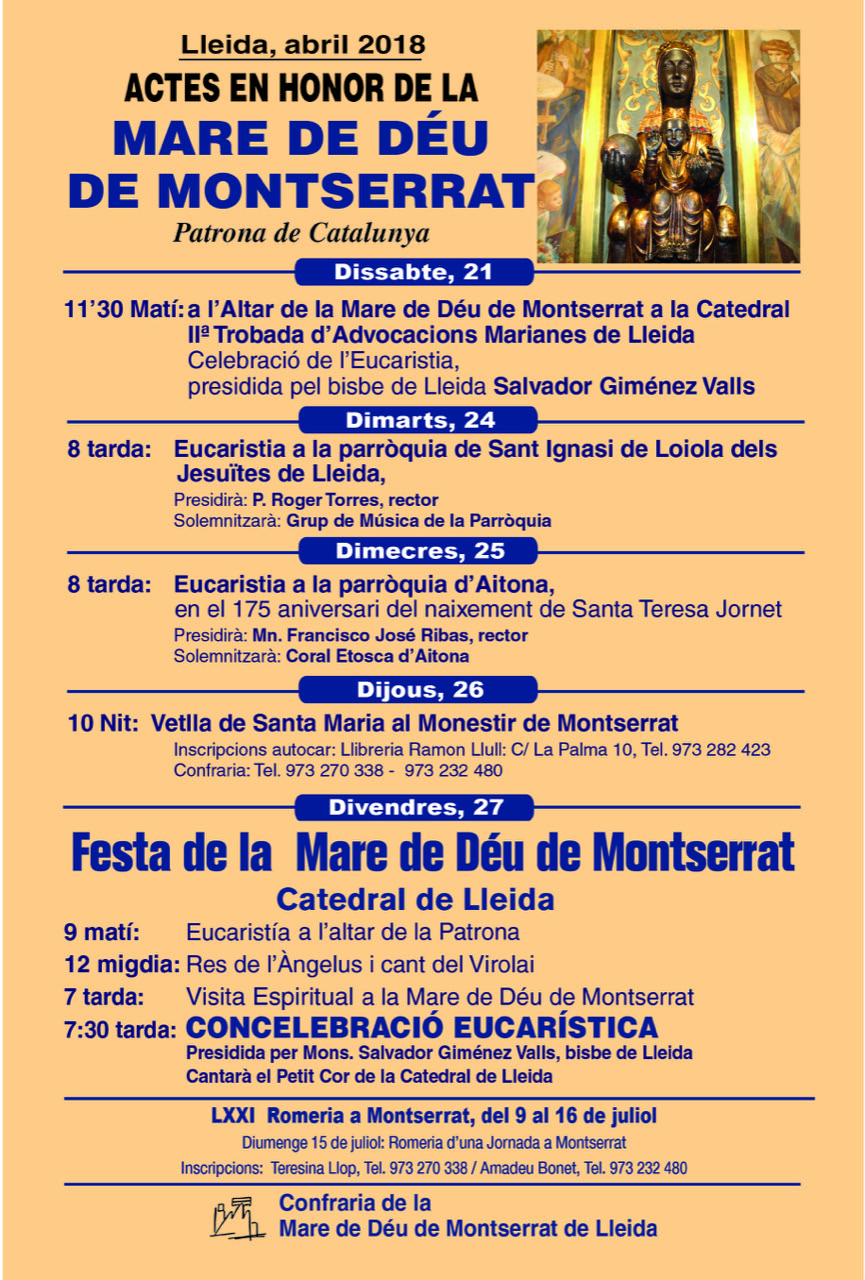 Els actes en honor a la Mare de Déu de Montserrat, tindran continuïtat el dimarts 24 d’abril amb el primer dia del Triduo de preparació a la festa de la Patrona. Serà a les 8 de la tarda, amb una Eucaristia a la parròquia de Sant Ignasi de Loiola dels jesuïtes de Lleida, amb ocasió del seu 40 aniversari i en record del P. Joan Suñol. El segon dia del Triduo se celebrarà a Aitona, amb motiu del 175 aniversari del naixement de Santa Teresa Jornet, fundadora de les germanetes dels Ancians Desemparats i del 60 aniversari de la seva beatificació (27 d’abril de 1958). A partir de les 6 de la tarda es prevista una visita a la Residència Santa Teresa Jornet, a la Casa Natal de la Santa i a la primera casa asil. Tot seguit a les 8 de la tarda tindrà lloc l’Eucaristia a la parròquia d’Aitona. El tercer dia del Triduo la Confraria el dedica a participar en la Vetlla de Santa Maria al Monestir de Montserrat, organitzant una autocar.