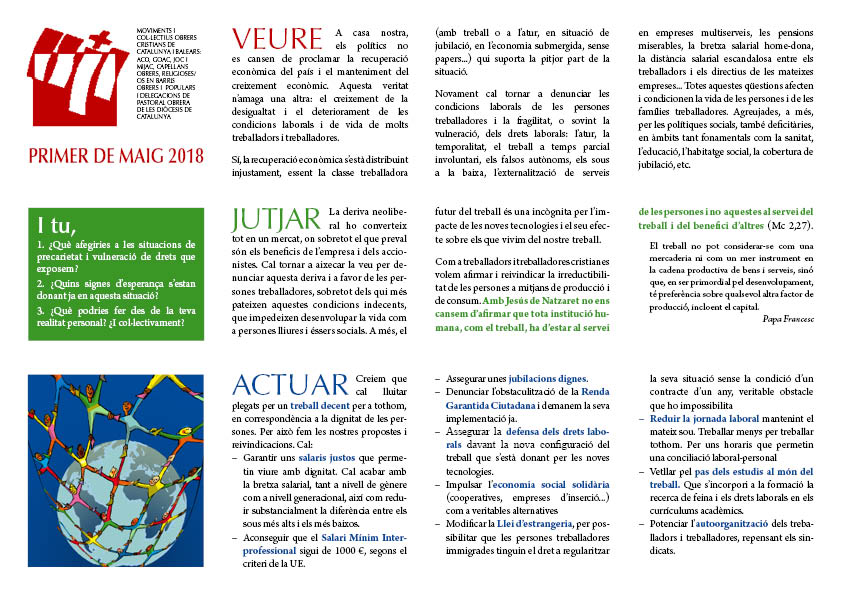 En el document adjunt teniu el manifest del Primer Maig que han elaborat diversos col·lectius d'Església com ACO, GOAC, JOC i MIJAC i les delegacions de Pastoral Obrera de les Diòcesis de Catalunya.