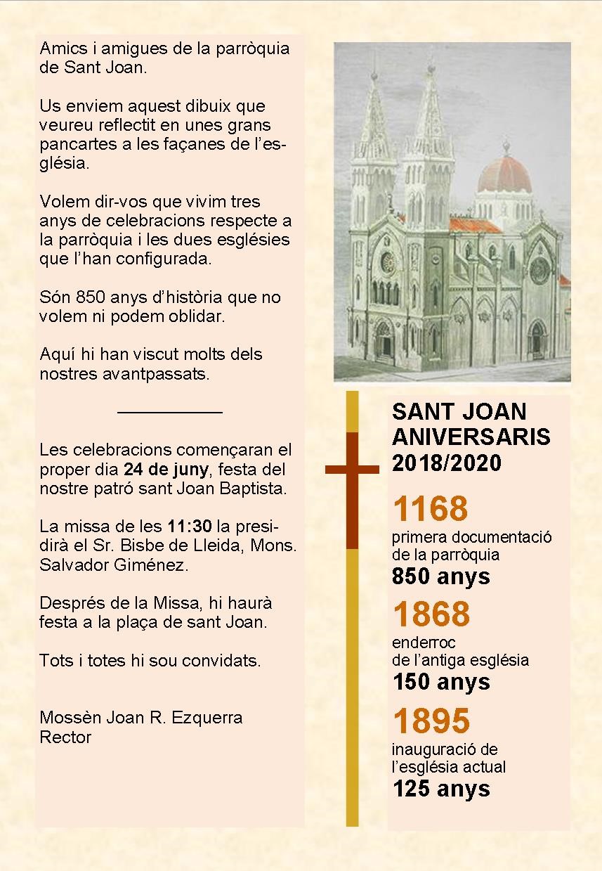 El proper 24 de juny, Festa de Sant Joan, diumenge, la parròquia de Sant Joan Baptista de Lleida inicia la celebració de tres aniversaris que es commemoraran al llarg del trienni 2018-2020.