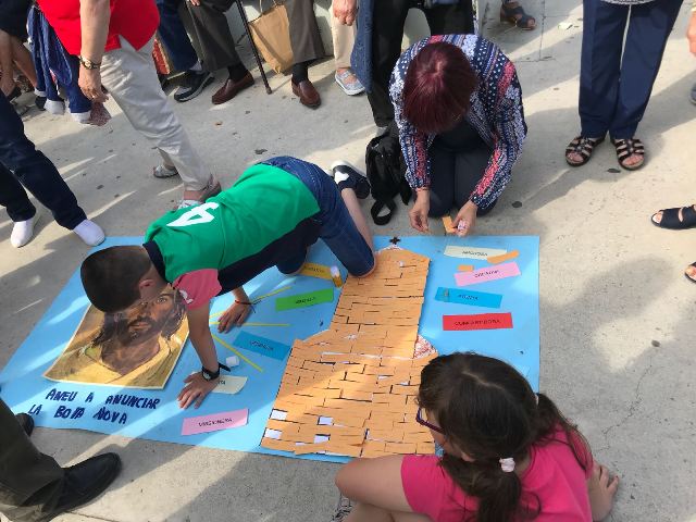 Es va fer un mural molt gran, en una part hi havia un edifici amb una creu. A l’altra part la imatge de Jesús, amb uns raigs de llum, cadascú va col·locar a l’edifici una pedra amb el nom, fins a formar l’Església de pedres vives; amorosa, senzilla, compartidora, humil, evangelitzadora, creativa, acollidora, missionera, espiritual, oberta, atenta, atreveix-te.... La llum de Jesús, sota la protecció de Santa Maria ens envia a anunciar la Bona Nova. Tot seguit els participants es van enllaçar amb els braços i van cantar “l’hora dels adéus”.