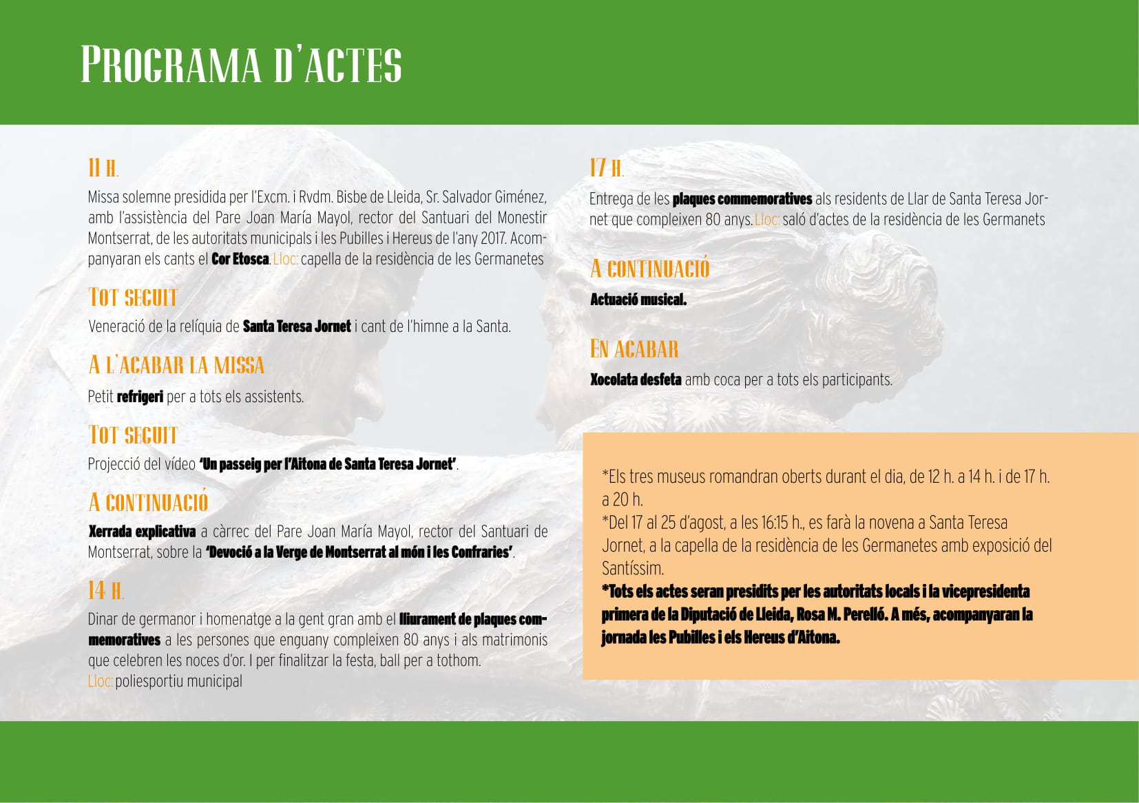 Després de la celebració es venerarà la relíquia de Santa Teresa Jornet. En acabar la missa es farà un refrigeri per a tots els assistents i es projectarà el vídeo 'Un passeig per l'Aitona de Santa Teresa Jornet'. I a continuació, el Pare Joan María Mayol impartirà una xerrada explicativa sobre la Devoció a la Verge de Montserrat al món i les Confraries.