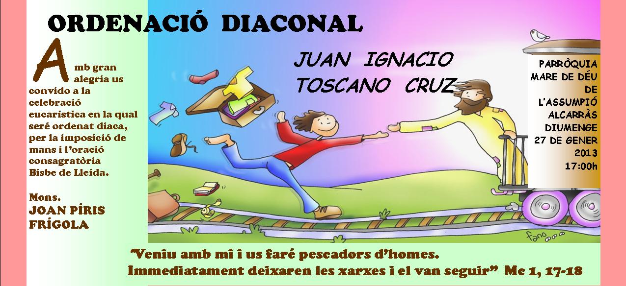 El seminarista, Juan Ignacio Toscano Ruíz, serà ordenat diaca pel nostre bisbe, Mons. Joan Piris, diumenge vinent, a les 5h de la tarda, a la Parròquia de l'Assumpció d'Alcarràs.