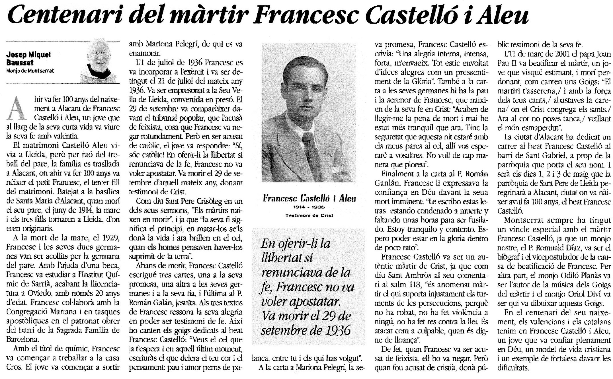 El Dissabte Sant (19 d’abril), a les 12 del migdia, al Cementiri de Lleida, tingué lloc un senzill i emotiu acte de commemoració del Centenari del naixement de Francesc Castelló. El beat va nàixer circumstancialment a Alacant, el 19 d’abril de 1914, ciutat on s’havia traslladat la família per motius laborals del pare.