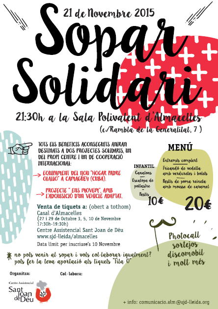 El Centre Assistencial Sant Joan de Déu organitza un Sopar Solidari el pròxim 21 de novembre de 2015, a les 21,30 hores, a la Sala Polivalent d’Almacelles (Rambla de la Generalitat, 7).