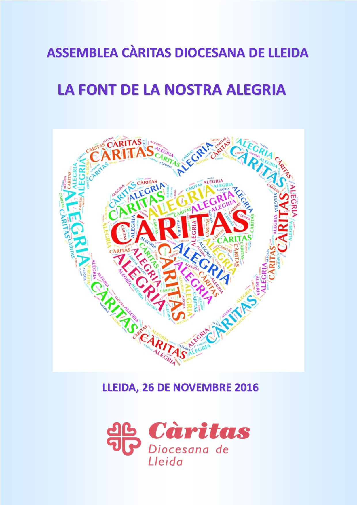 Càritas Diocesana de Lleida celebrarà el pròxim dissabte 26 de novembre la seva Assemblea Diocesana amb el títol: La Font de la Nostra Alegria. La trobada tindrà lloc al col·legi Maristes Montserrat de Lleida, de les nou del matí a les cinc de la tarda.