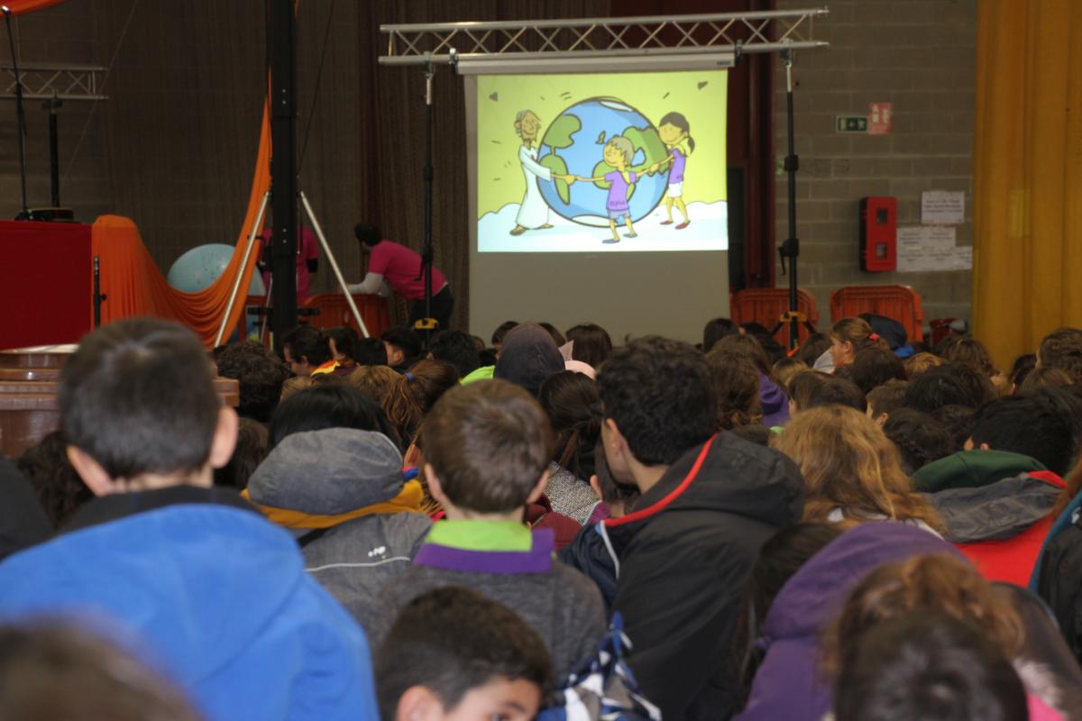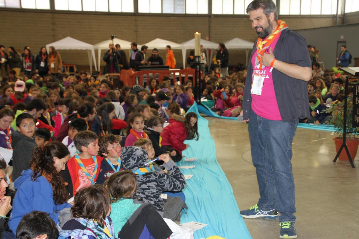 El diumenge vam fer una gran activitat tots junts, les més de 4.000 persones, moguda dalt de l'escenari, ens van donar una motxilla a cadascú amb una gorra de diferents colors i més material per poder fer les macro-activitats i unes fotos ben espectaculars! En un moment del matí cadascú vam treure de la motxilla una cinta de plàstic i les vam anar nuant. les unes amb les altres. per tal de crear una xarxa enorme! Va ser un moment molt significatiu perquè vam simbolitzar el gran entrellat de persones que formem el moviment d'esplais, amb il·lusió i ganes de canviar el món, i que si ens unim tots, som imparables!