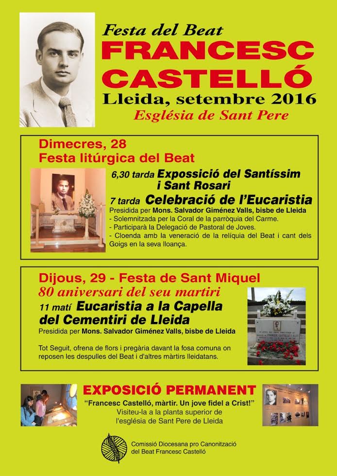 La Comissió Diocesana Pro Canonització del Beat Francesc Castelló, celebrarà demà dimecres 28 de setembre, la festa litúrgica del Beat lleidatà.