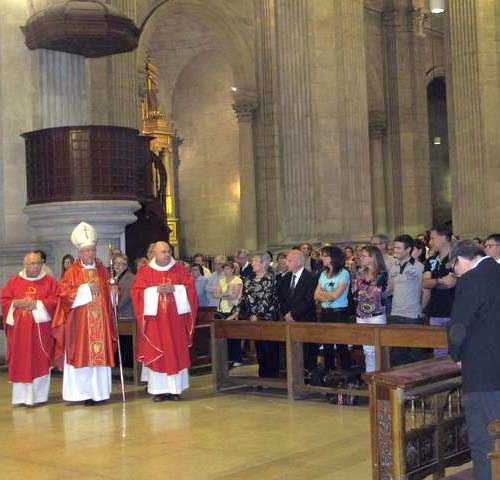 Diversos objectes ens han recordat els màrtirs durant la celebració: Uns quadres amb les seves fotos al presbiteri, una relíquia del bisbe Huix sobre l’altar i una faixa d’ell en les ofrenes, així com una còpia de l’Acta Apostòlica de la beatificació. Així mateix, el cant “Amunt, germans” de final de la celebració, per recordar que molts dels màrtirs ho cantaven camí del martiri.