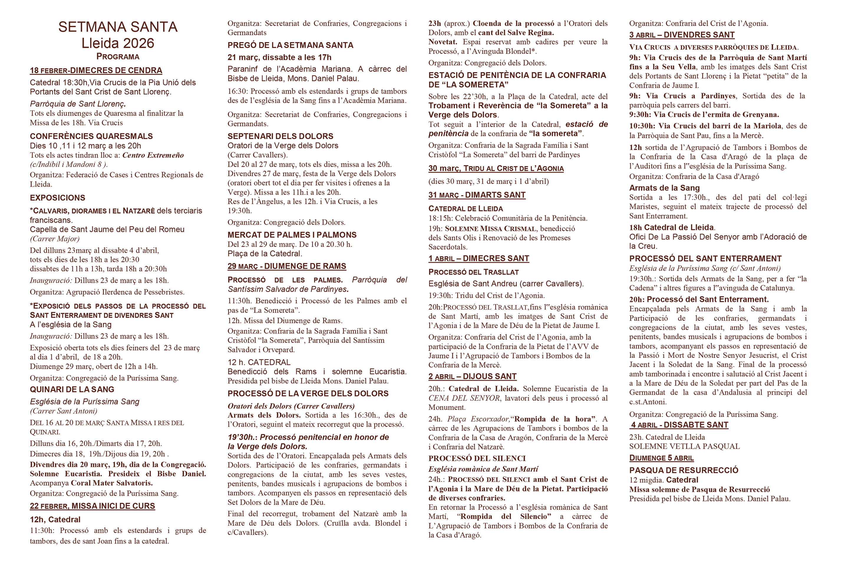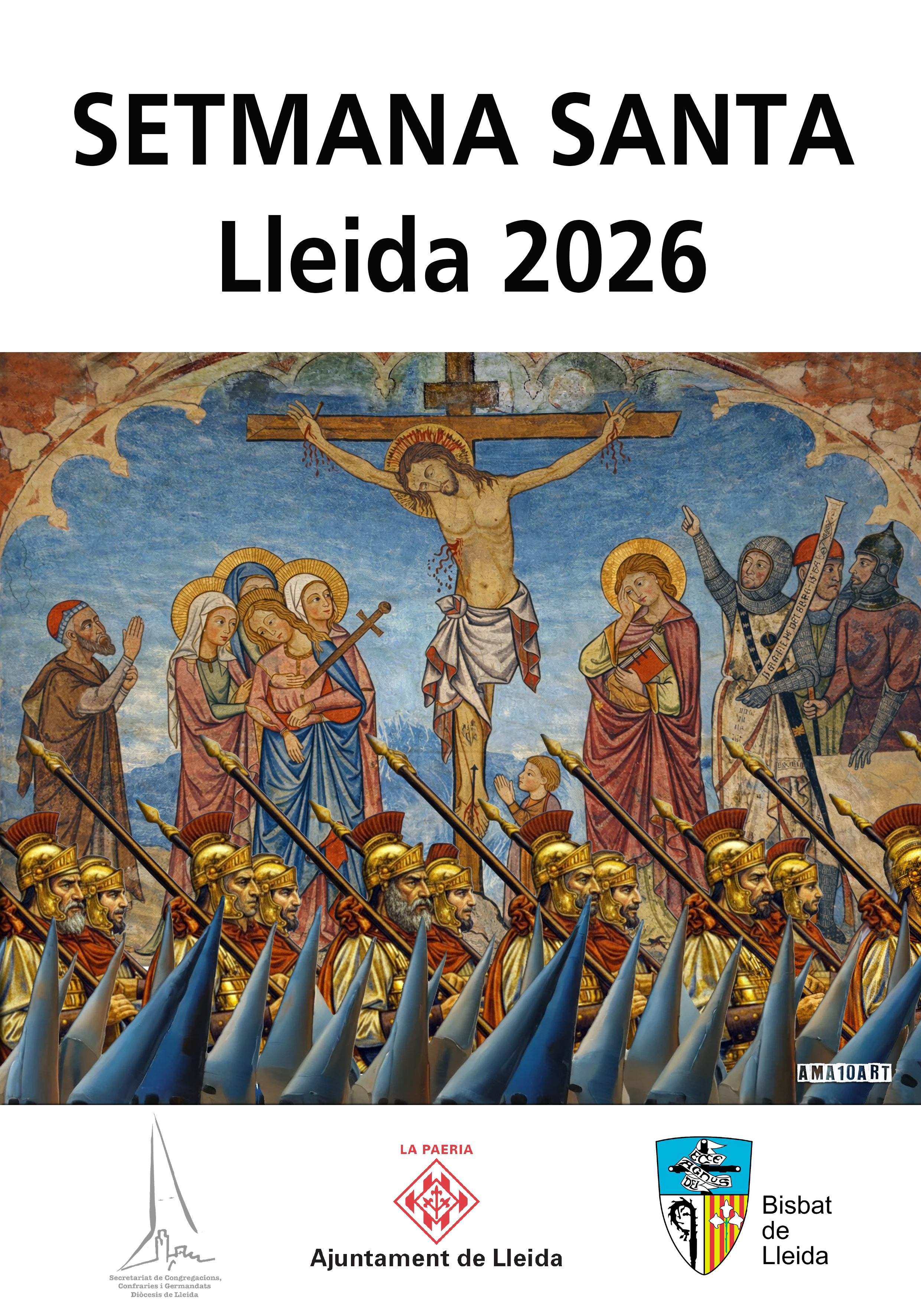 |27-02-26| El Secretariado de Cofradías, Congregaciones y Hermandades ha presentado este mediodía, en el Palacio Episcopal de Lleida, el cartel de la Semana Santa de Lleida, obra del artista Amadeu Bonet. El autor ha destacado que el cartel integra diversos elementos leridanos: «Por un lado, hay una pintura de la crucifixión que se encuentra en la capilla de Santa Margarita de la Seu Vella; por otro, algunos de los protagonistas de las procesiones, como los armados de la Sangre y de los Dolores y los penitentes con sus vestas».