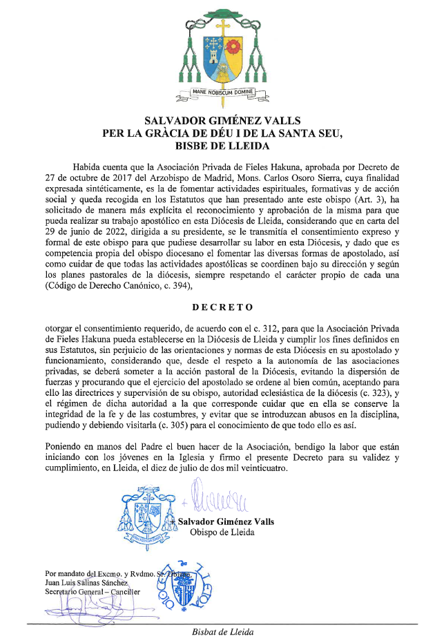Consentimiento al establecimiento en Lleida de la Asociación Hakuna