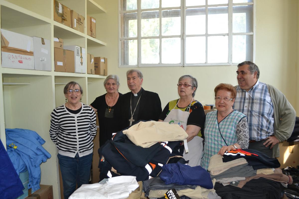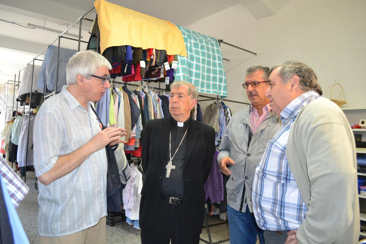 El director de Cáritas Lleida, Ramon Baró, la secretaría general de Cáritas Diocesana de Lleida, María José Rosell, y el gerente de Troballes, Josep Fernández, y otros miembros del patronato de la Fundación Jaume Rubió i Rubió, recibieron al señor obispo y le mostraron el trabajo que se hace en la empresa de reinserción.