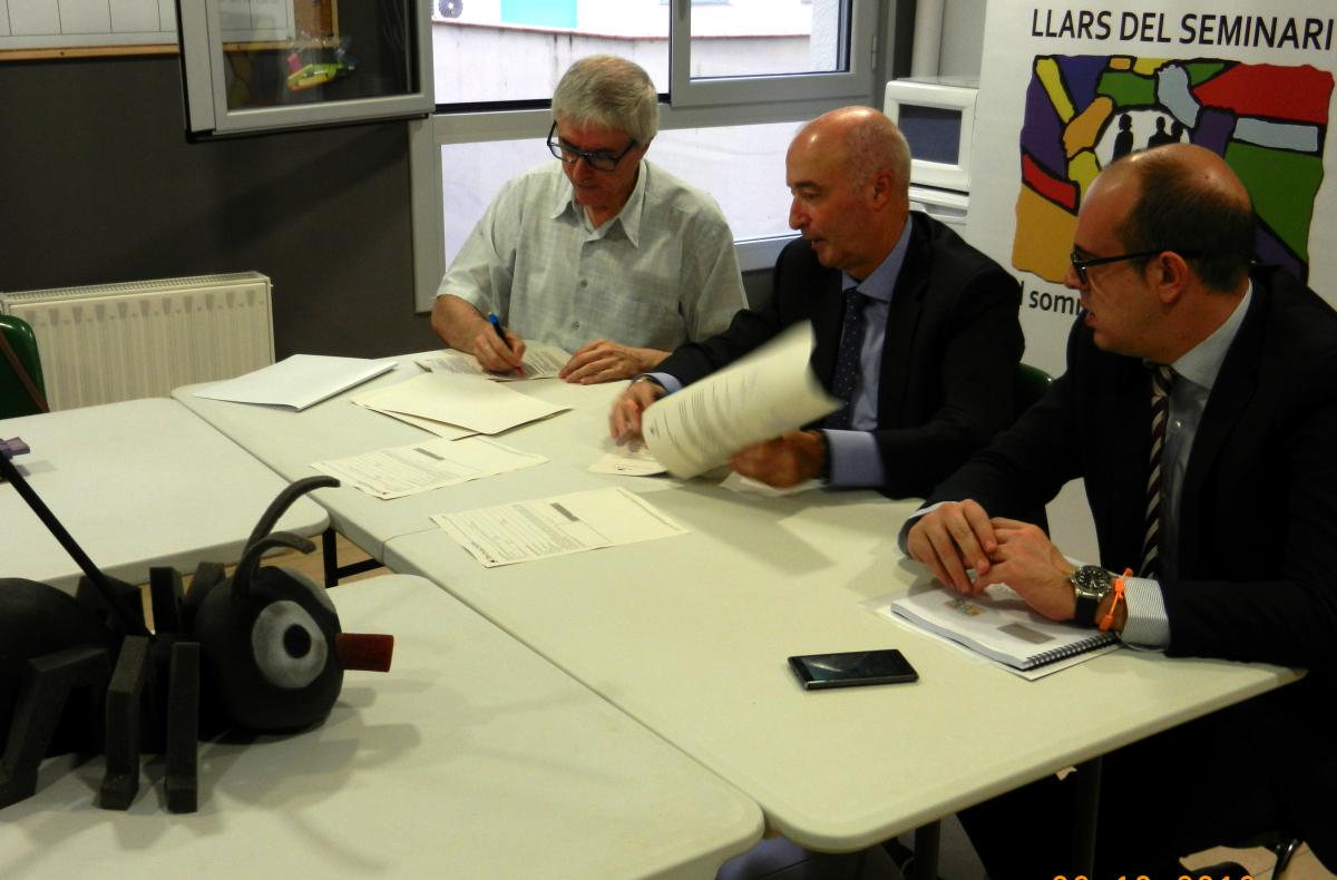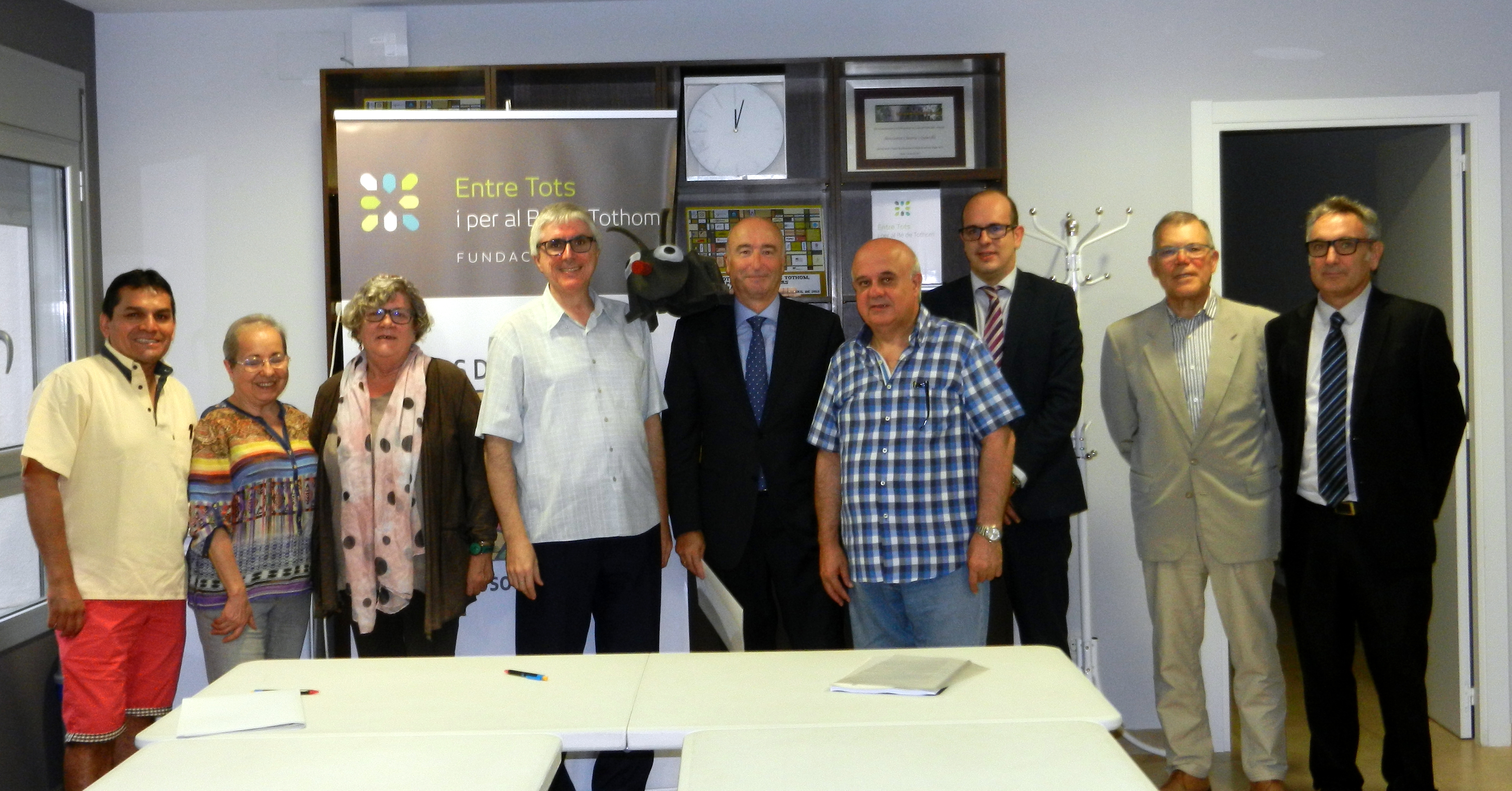 Carles Sanmartin, presidente de la Fundación Entre Todos y Para el Bien de Todos, y Ignacio Fanlo, director de Área de Negocio de CaixaBank en Lleida Ciudad, acompañado por Geremi Cami, Director Banca de Instituciones de CaixaBank en Lleida, han firmado el convenio...