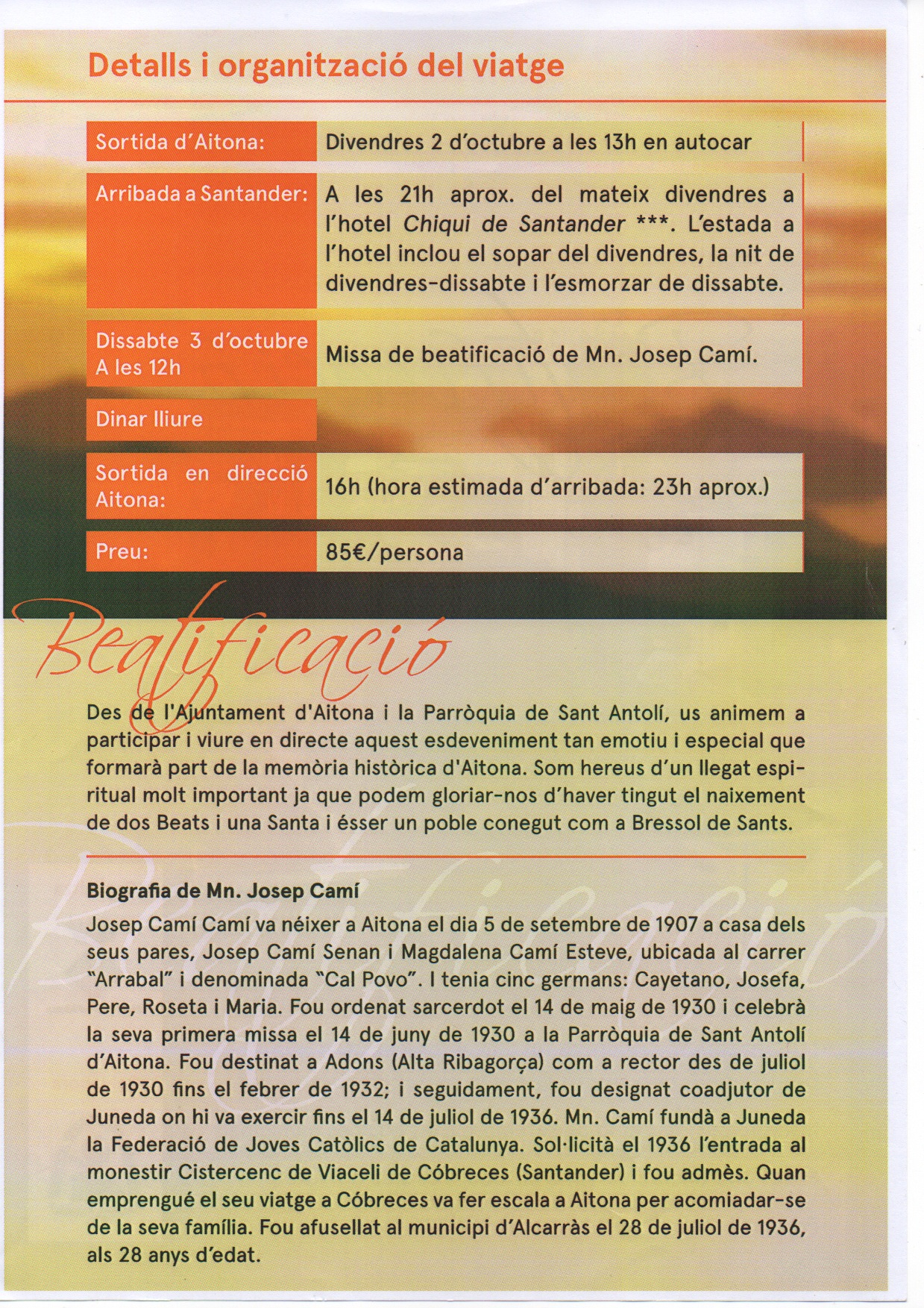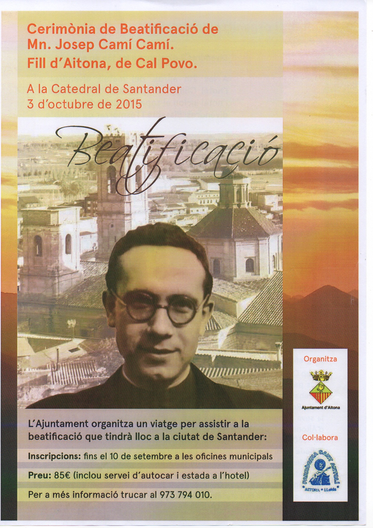 El sábado día 3 de octubre, a las 12 del mediodía, tendrá lugar en la Catedral de Santander (Cantabria) la beatificación de padre Josep Camí Camí, mártir de Aitona que pasará a formar parte del grupo de los Mártires de Viaceli (de la orden cisterciense de Cobreces). Para los interesados en asistir a la ceremonia, el día anterior, 2 de octubre, a la 1 del mediodía, partirá de Aitona un autobús que se dirigirá a Santander.