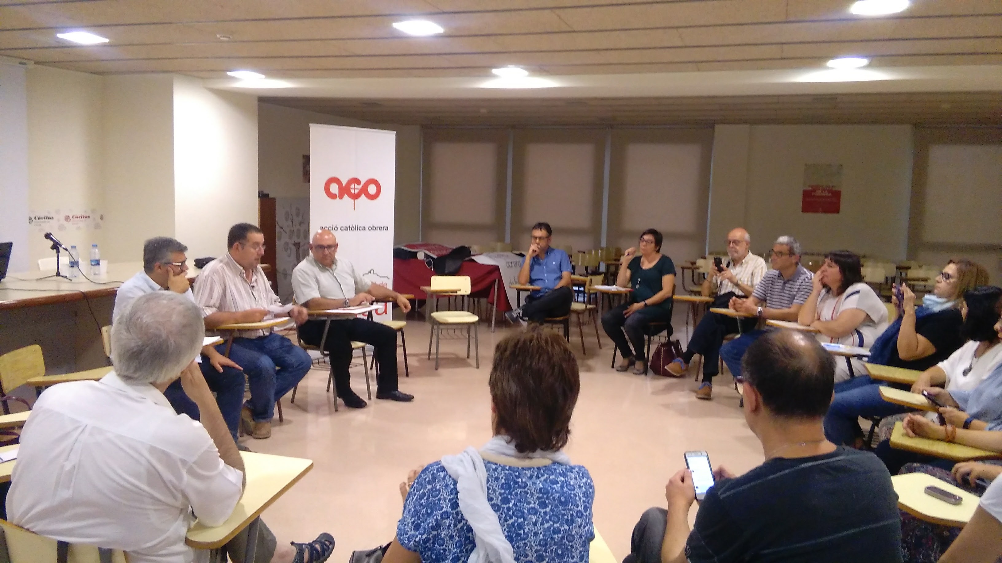 El pasado 6 de octubre tuvo lugar una mesa redonda para celebrar el día del Trabajo Decente en la sede de Cáritas Diocesana de Lleida. Participaron Ramón y Antoni de los sindicatos de UGT y CCOO que hablaron sobre la defensa de los derechos de los trabajadores.