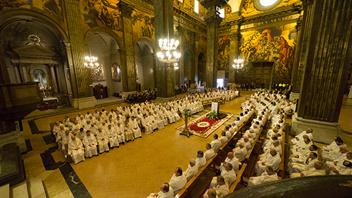 El arzobispo de Barcelona presentó el cardenal Beniamino Stella, que había sido nuncio apostólico en Cuba y Colombia, antes de que el Papa Francisco le encargara la Congregación para el Clero. El cardenal Stella, haciendo eco de las catequesis y las homilías del Papa, destacó la importancia de los sacerdotes como anunciadores de la misericordia de Dios, recordando la belleza de su primer encuentro con Jesús, que ha sido misericordioso con ellos y los ha escogido para que, a su vez, sean mensajeros de esta misericordia, en el servicio ministerial de cada día y muy especialmente en la celebración del sacramento de la reconciliación. El cardenal dijo también que la misericordia de Dios se debe de anunciar explícitamente en las homilías, en la catequesis, en la escuela, en los medios de comunicación y en la propia vida. Y así mismo ensalzó la fraternidad, que se origina en los sacramentos, como signo creíble de comunión entre nosotros y de anuncio del amor y la misericordia inagotables de Dios.