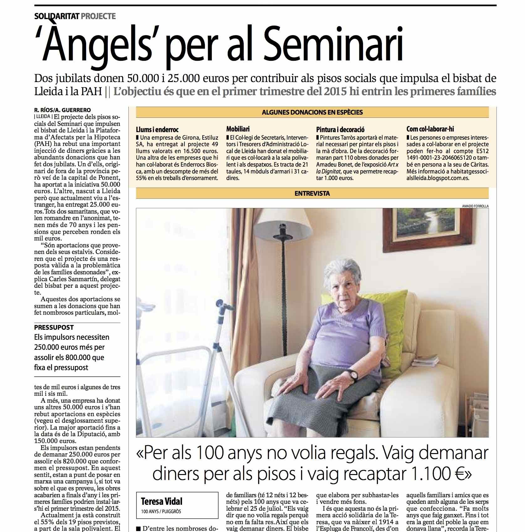 El diario Segre titula de este modo la información sobre los Pisos del Seminario que han recibido en los últimos días un par de donaciones económicas bastante significativas -50.000 y 25.000 euros- de dos personas jubiladas, una de ellas nacida fuera de Lleida, pero residente en la capital de Ponent, y la otra, leridana, pero viviendo en el extranjero, que han aportado los ahorros de su vida a este proyecto social impulsado por el Obispado de Lleida.
