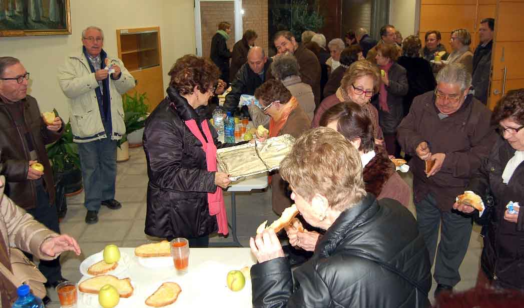 Después se ha proyectado un vídeo sobre el hambre en el mundo, para pasar a continuación al vestíbulo de la iglesia donde, de pie, ha tenido lugar lo que popularmente se conoce como "el sopar de la fam". Es una cena diferente de lo que se hace habitualmente, sólo una rebanada de pan con aceite y una manzana. Pero es mucho más que una cena. Es un acto de solidaridad con las personas más pobres del Tercer Mundo, y a la vez, querer sentir, aunque sea por un día, lo que representa la falta de alimentos. Ha sido un tiempo para compartir, para recuperar fuerzas y decir con convencimiento: Estamos dispuestos a trabajar en el proyecto de Dios, a difundirlo y apuntarnos a luchar contra la pobreza, como se nos pide este año desde Manos Unidas.