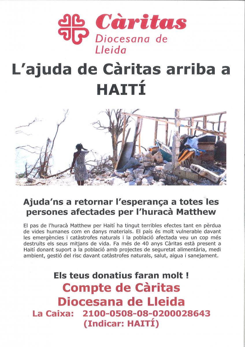 Hace más de 40 años que Cáritas está presente en Haití para apoyar a la población con proyectos de seguridad alimentaria, medio ambiente, gestión del riesgo ante catástrofes naturales, salud, agua y saneamiento. Cáritas Diocesana de Lleida ha abierto una cuenta para colaborar en paliar los efectos de esta catástrofe. Pueden dar sus donativos a la cuenta 2100-0508-08-0200028.