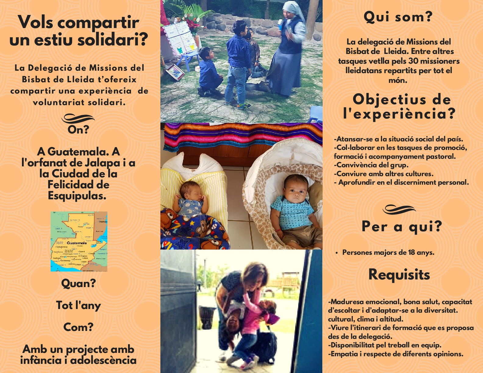 La delegación de Misiones ofrece una formación y un acompañamiento a las personas que quieran participar en este proyecto de voluntariado misionero, así como un seguimiento posterior después del viaje. Hay que recordar que desde el pasado mes de noviembre, Mn. Víctor Espinosa hace una tarea misionera en Esquipulas.